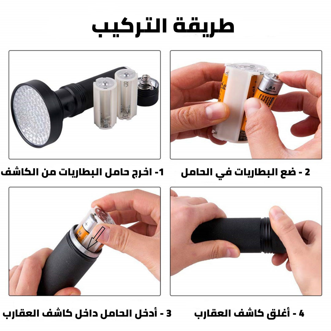 توضع كل 3 بطاريات في حامل للبطاريات ثم يوضع كل حامل داخل كاشف العقارب، أخيرا يغلق المصباح من الأسفل.